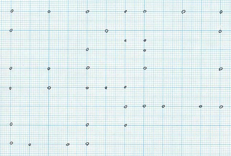 (1)用意するもの 方眼紙(できればB4の大きさをお勧めします。)、鉛筆、消しゴム (2)まず柱と壁を方眼紙に描いてみます。図1のように柱は小さな丸で表し、壁は直線で描きます。定規は使わずにフリーハンドで描いていきます。先に柱を描いて柱と柱をつなげていく感じで壁と窓を描いていきます。 図1 (3)では6帖の部屋を描いてみましょう。6帖の部屋は図2のように、たて3cmよこ4cmで表します。 図2 (4)次ぎにこの6帖に図3のように窓とクローゼットと入口を付けてみます。要領は初めに図4のように柱を全部描いてしまいます。柱は全部で12本です。柱を全部描いたあとで、窓、ドア、クローゼットをます。 図3 ここまでが柱と壁と窓で間取りを描く時の基礎になります。実際の建物でも柱がどこにくるのかということが重要なポイントです。どこに柱がきているかを把握しないで間取りを描くと一番影響がでるのが建物強度なのです。このことはまたあとのほうでお話します。